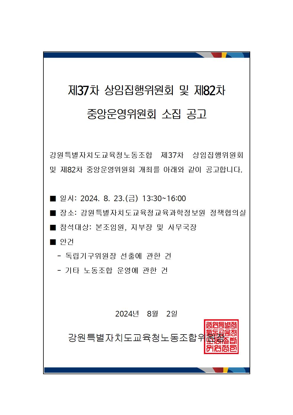 제37차 상임집행위원회 및 제82차 중앙운영위원회 소집 공고