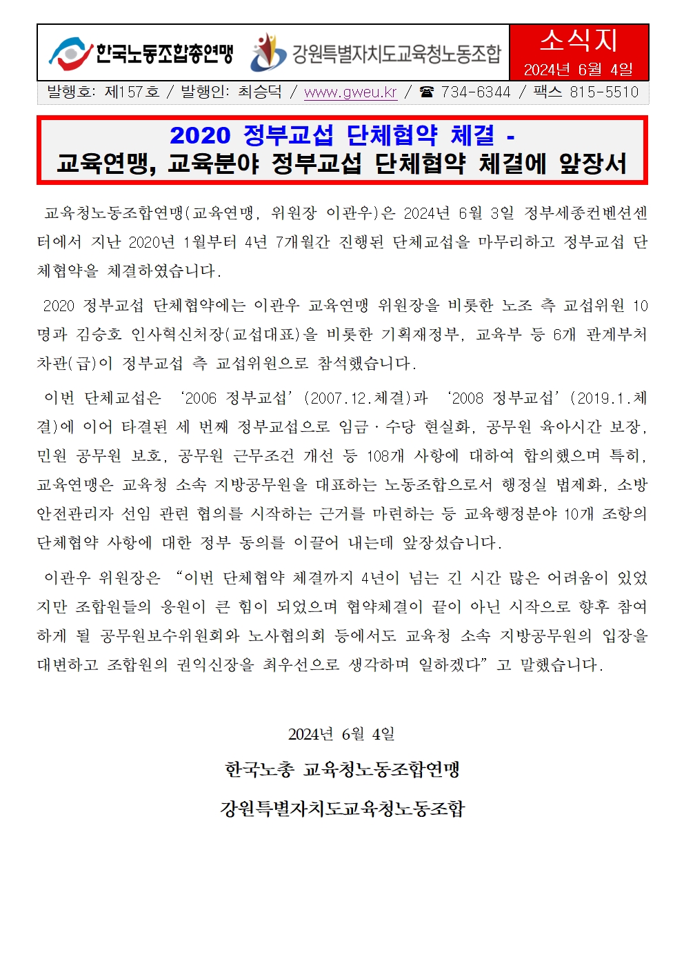 2020 정부교섭 단체협약 체결 - 교육연맹, 교육분야 정부교섭 단체협약 체결에 앞장서