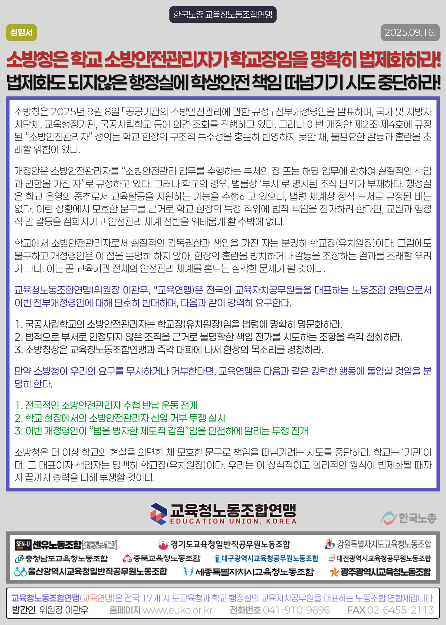 [성명서] 소방청은 학교 소방안전관리자가 학교장임을 명확히 법제화하라!.png