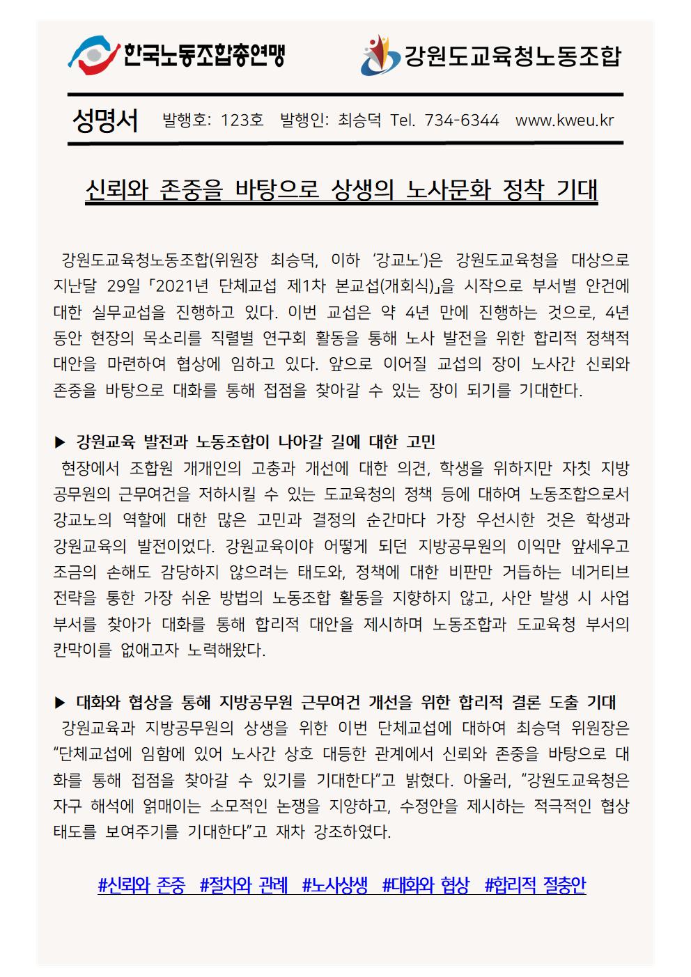 신뢰와 존중을 바탕으로 상생의 노사문화 정착 기대