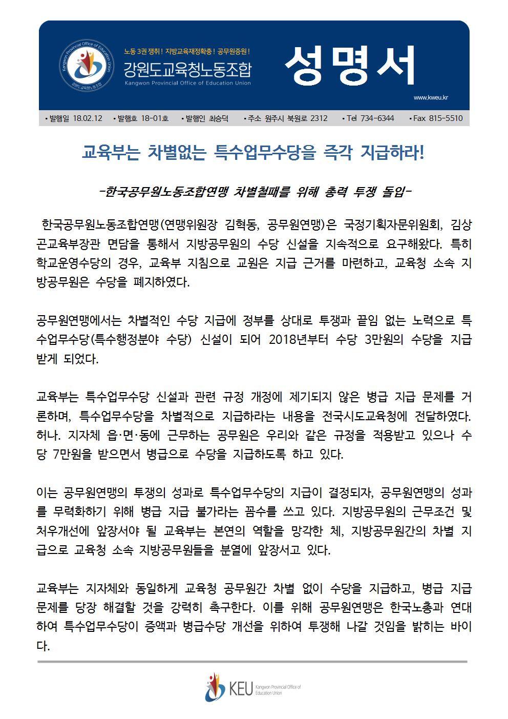 교육부는 차별없는 특수업무수당을 즉각 지급하라![제18-01호]