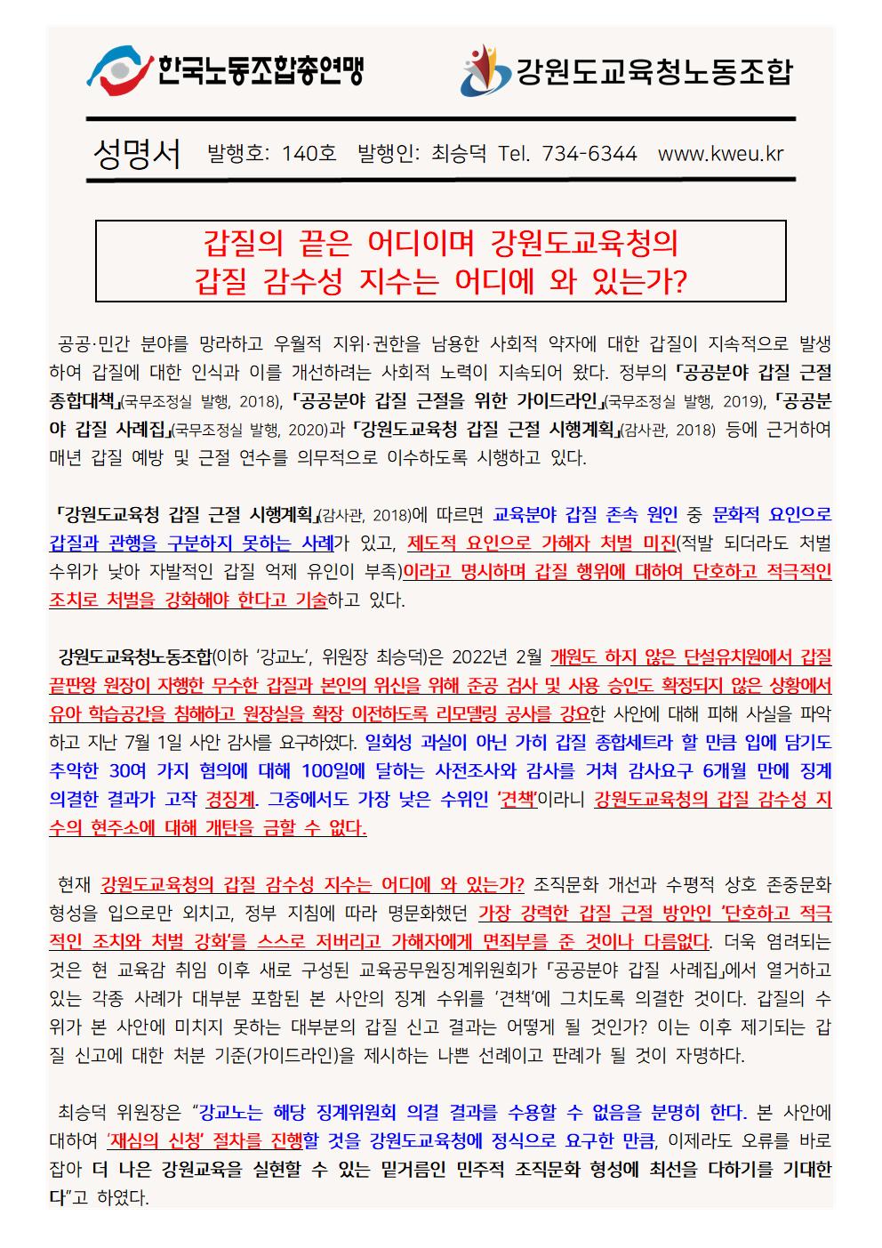 갑질의 끝은 어디이며 강원도교육청의 갑질 감수성 지수는 어디에 와 있는가?