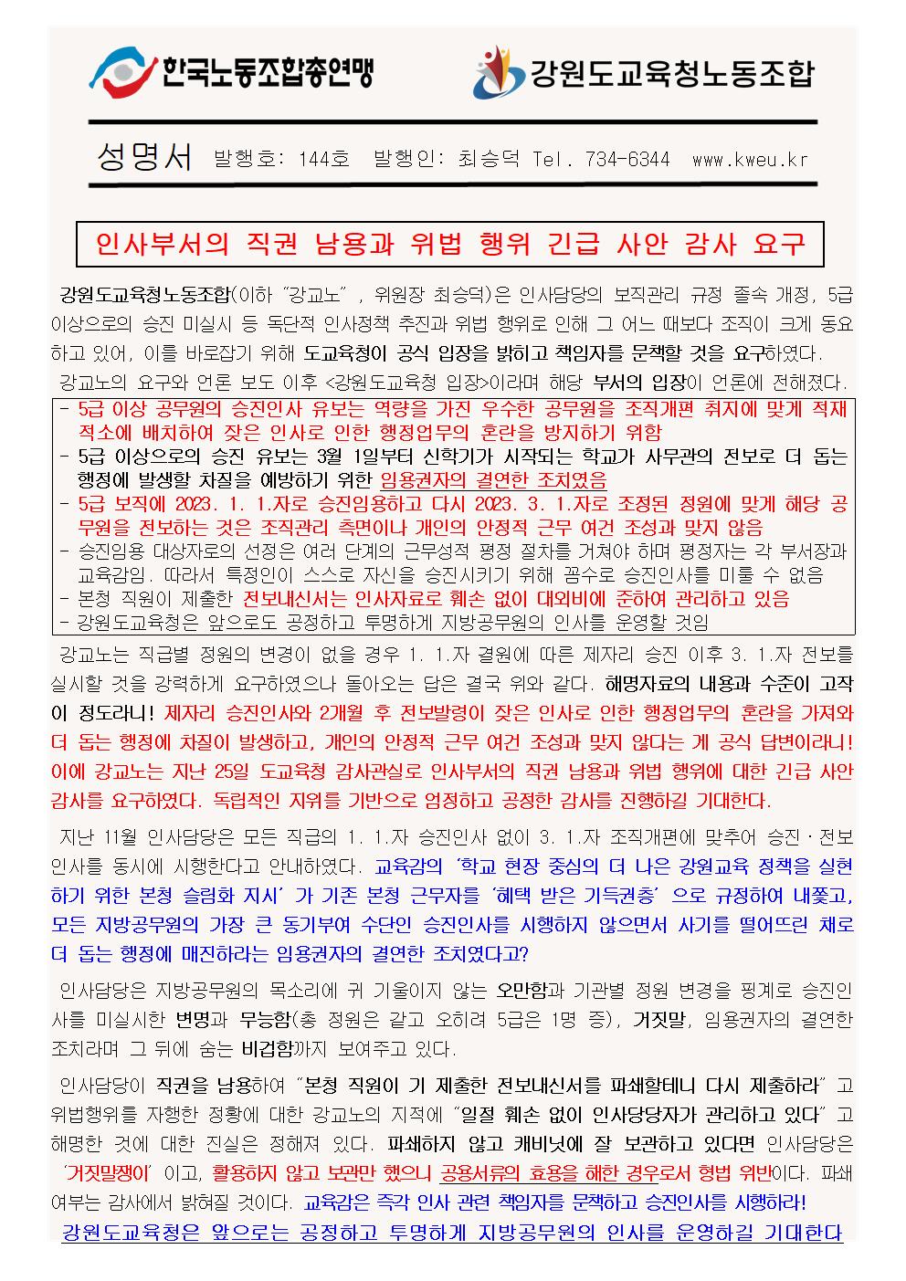 인사부서의 직권 남용과 위법 행위 긴급 사안 감사 요구