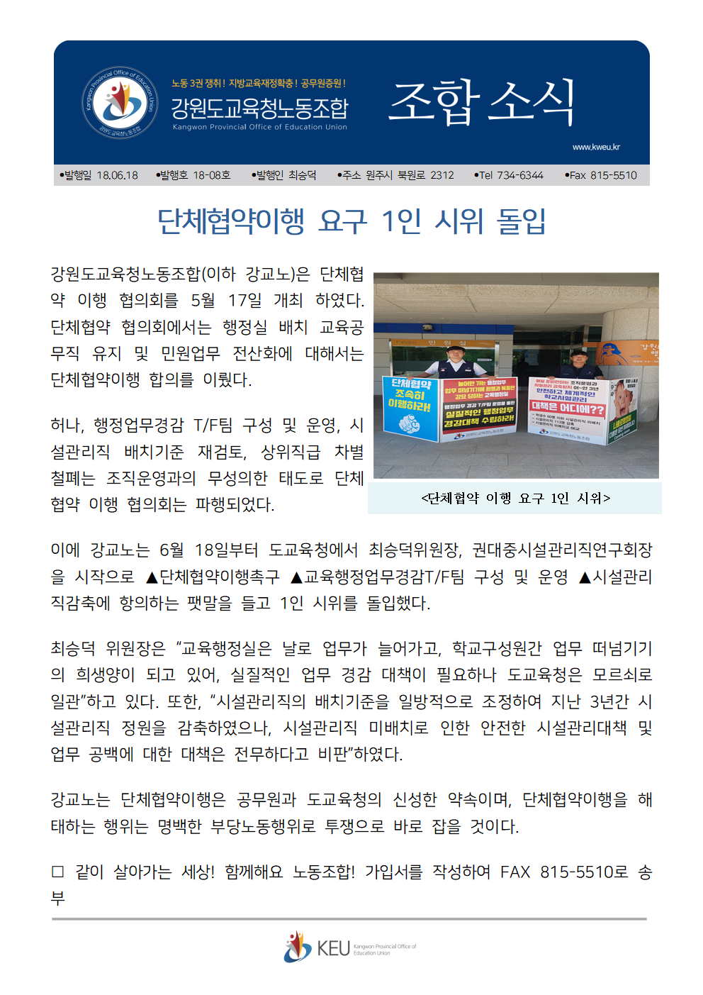 단체협약이행 요구 1인 시위 돌입 [제18-08호]