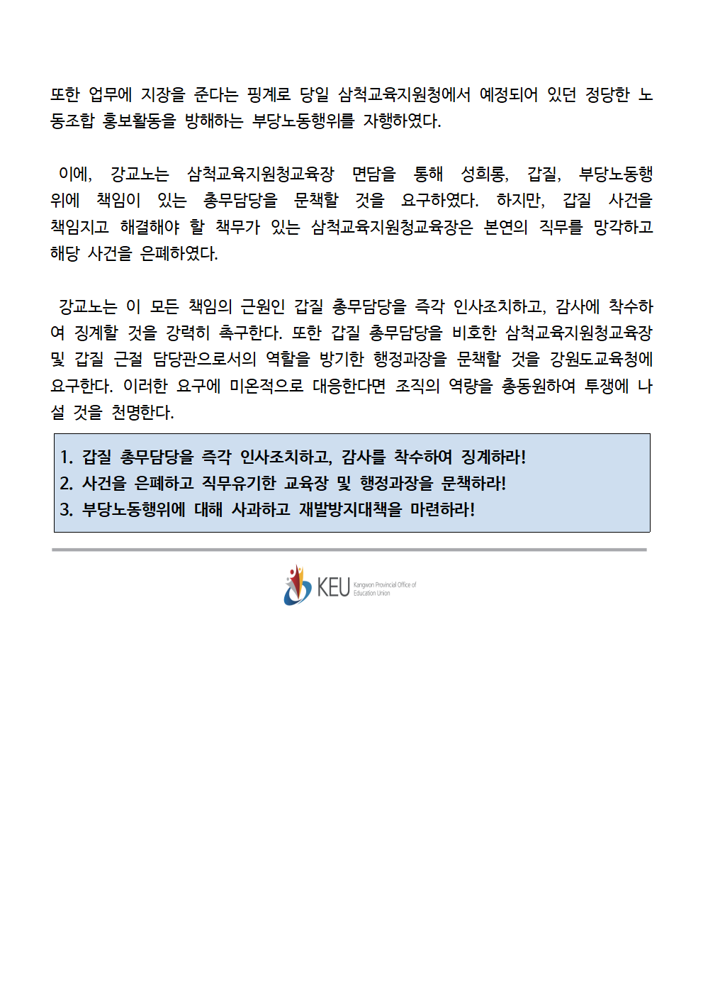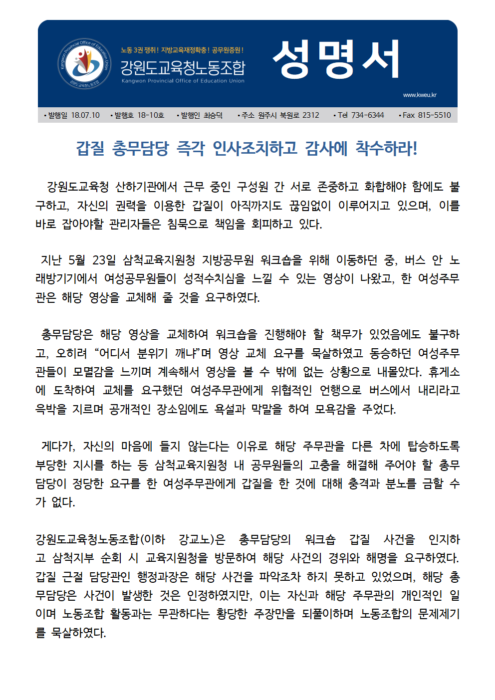갑질 총무담당 즉각 인사조치하고 감사에 착수하라! [제18-10호]