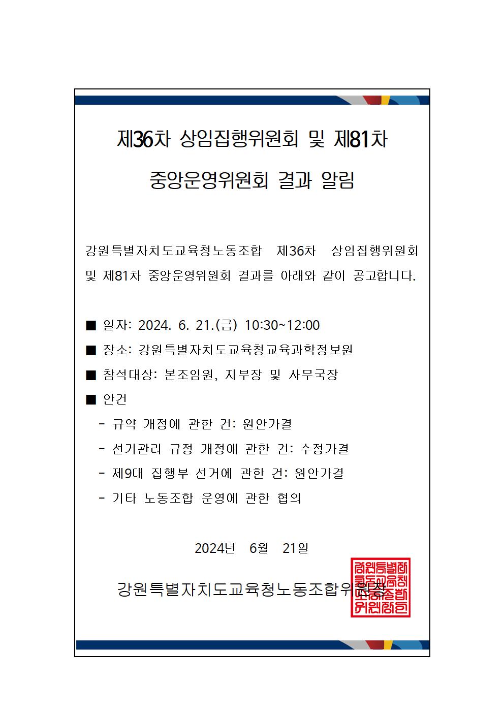 제36차 상임집행위원회 및 제81차 중앙운영위원회 결과 알림