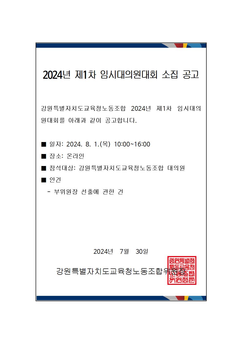 제9대 집행부 선거 당선인 공고(위원장 및 사무총장, 대의원)