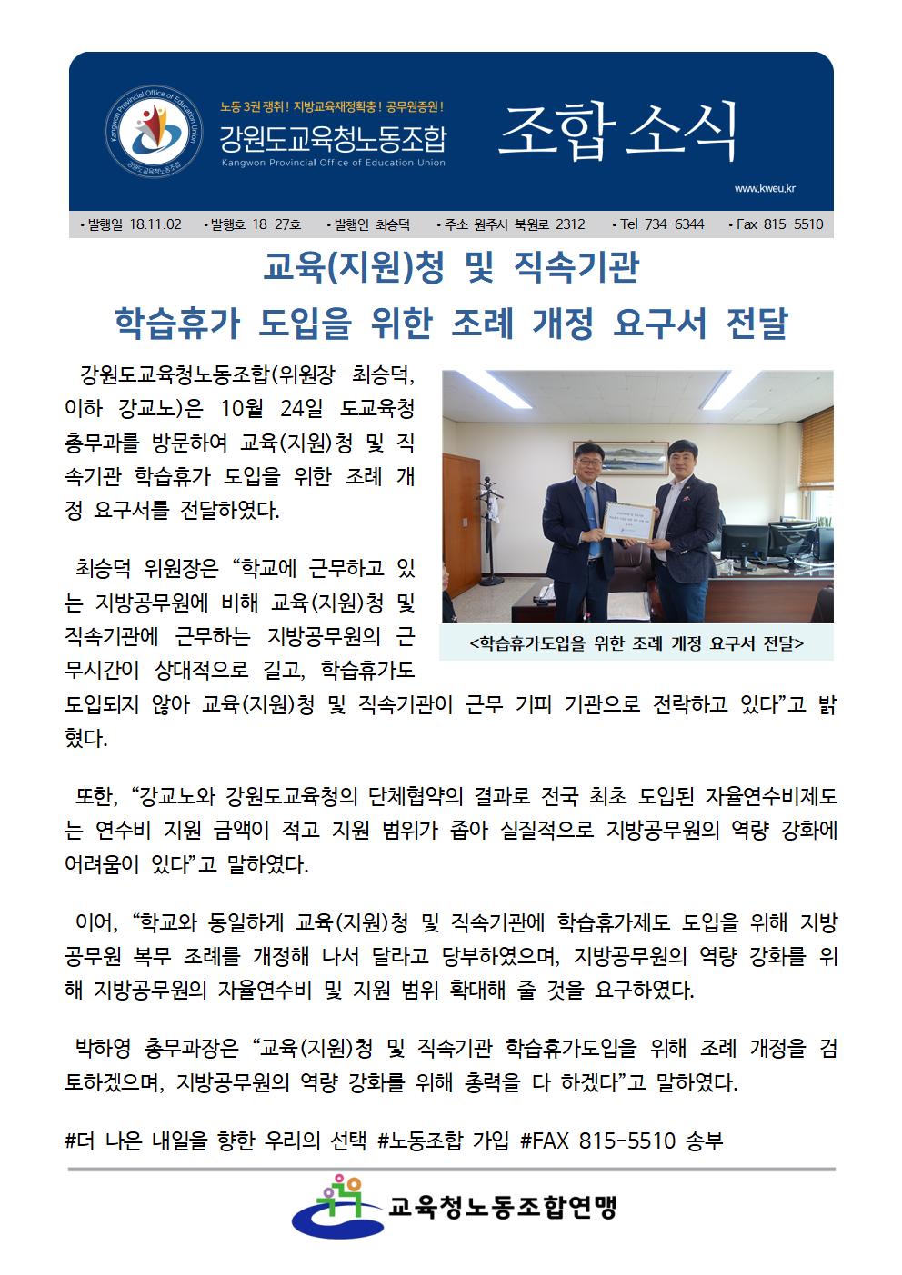 교육(지원)청 및 직속기관 학습휴가 도입을 위한 조례 개정 요구서 전달 [제18-27호]