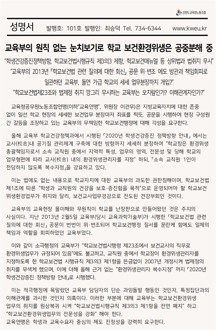 교육부의 원칙 없는 눈치보기로 학교보건환경위생은 공중분해 중