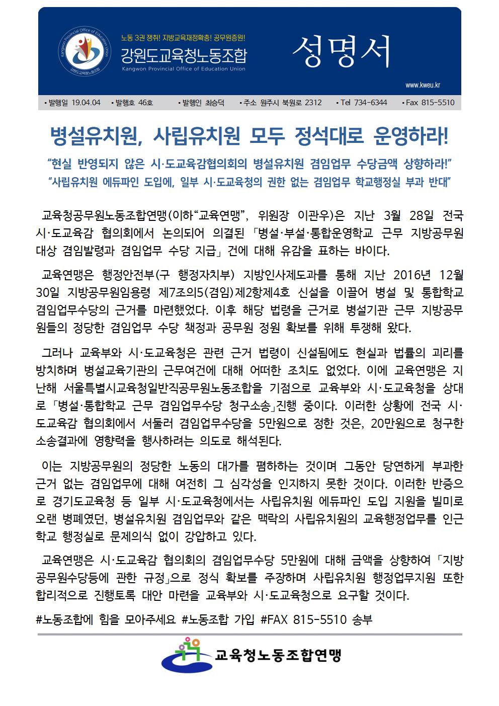 19.4.4 [소식지] 병설유치원, 사립유치원 모두 정석대로 운영하라!.hwp
