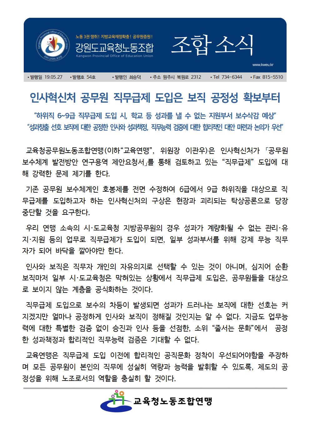 19.5.27 [소식지] 인사혁신처 공무원 직무급제 도입은 보직 공정성 확보부터.hwp