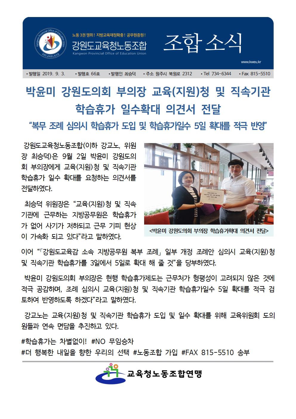 19.9.3 [소식지] 박윤미 강원도의회 부의장 교육(지원)청 및 직속기관 학습휴가 도입 및 일수확대 의견서 전달.hwp