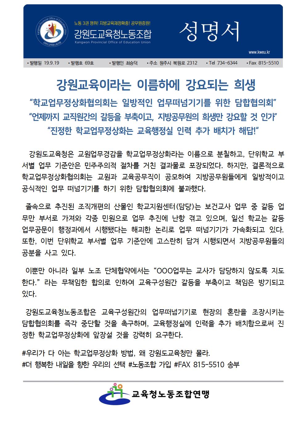 19.9.19 [성명서] 강원교육이라는 이름하에 강요되는 희생.hwp