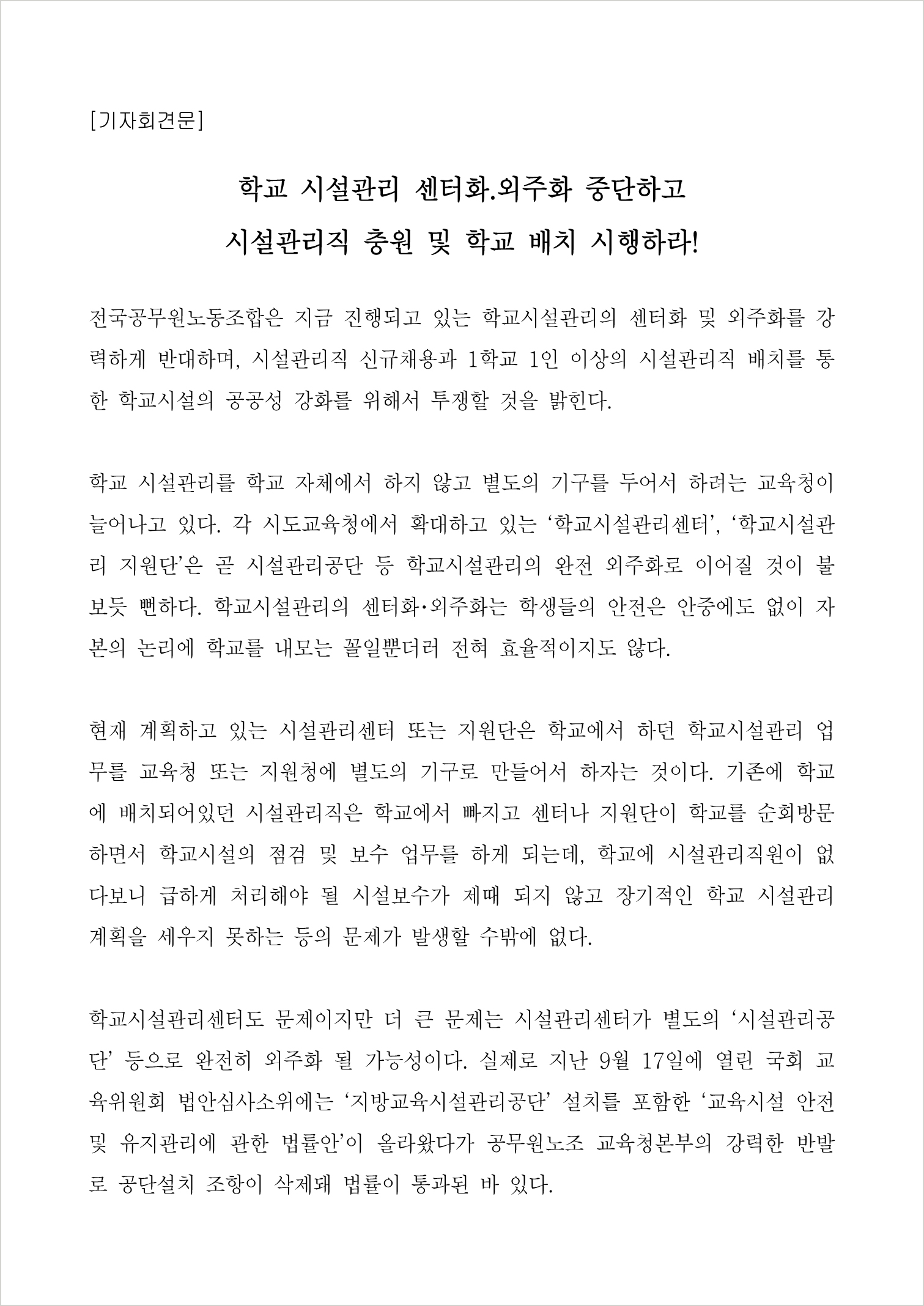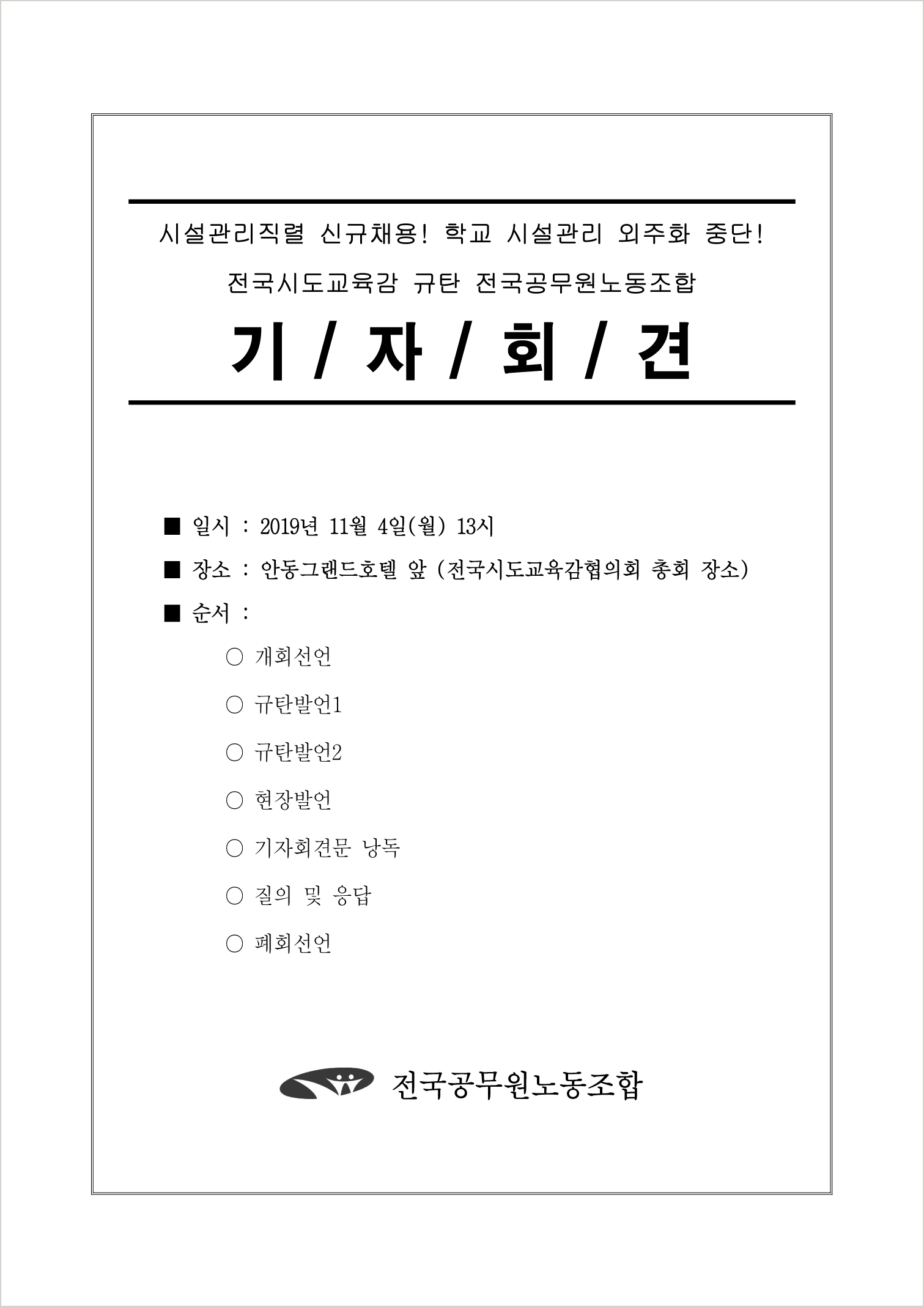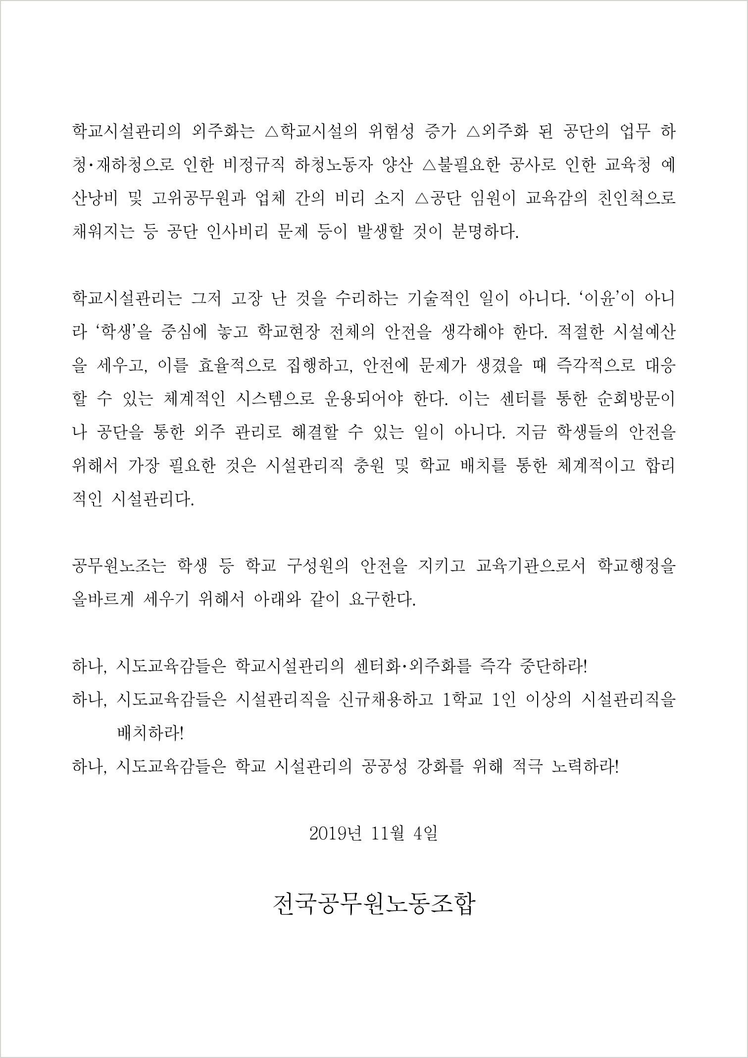 [전공노기자회견문] 시설관리직렬 신규채용! 학교 시설관리 외주화 반대! 전국시도교육감 규탄 기자회견(2019.11.04)