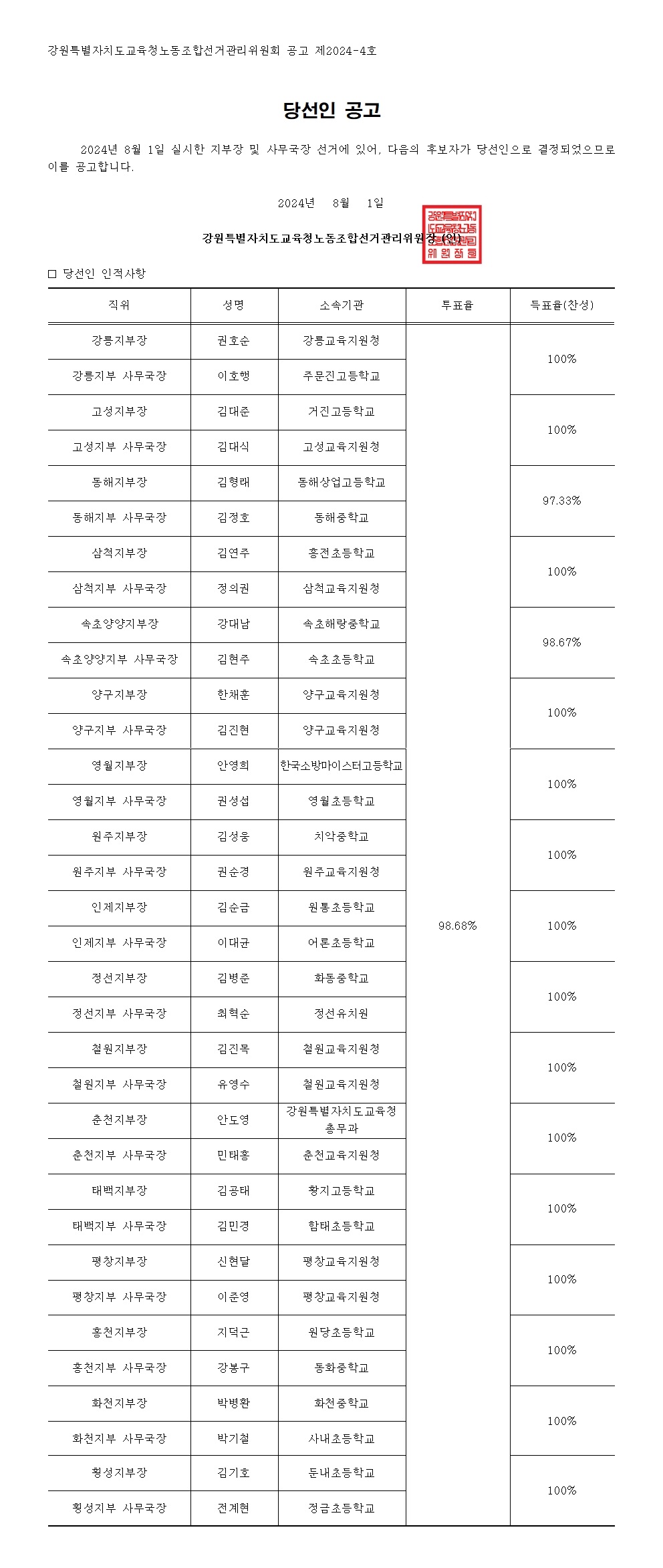 제9대 집행부 선거 당선인 공고(지부장 및 사무국장)