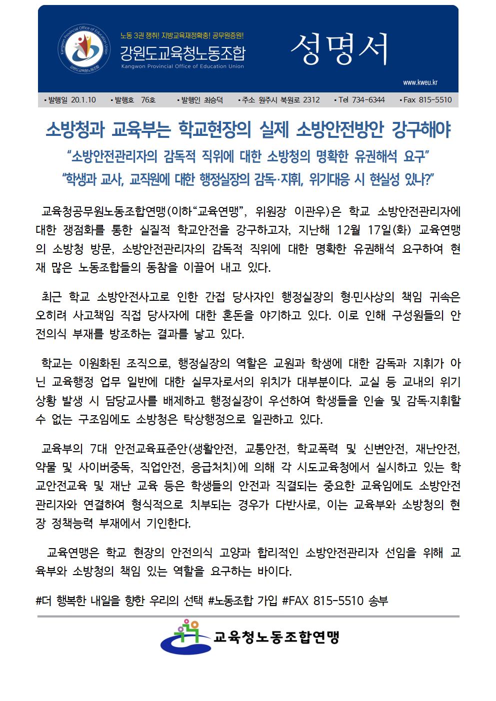 20.1.10 [성명서] 소방청과 교육부는 학교현장의 실제 소방안전방안 강구해야.hwp