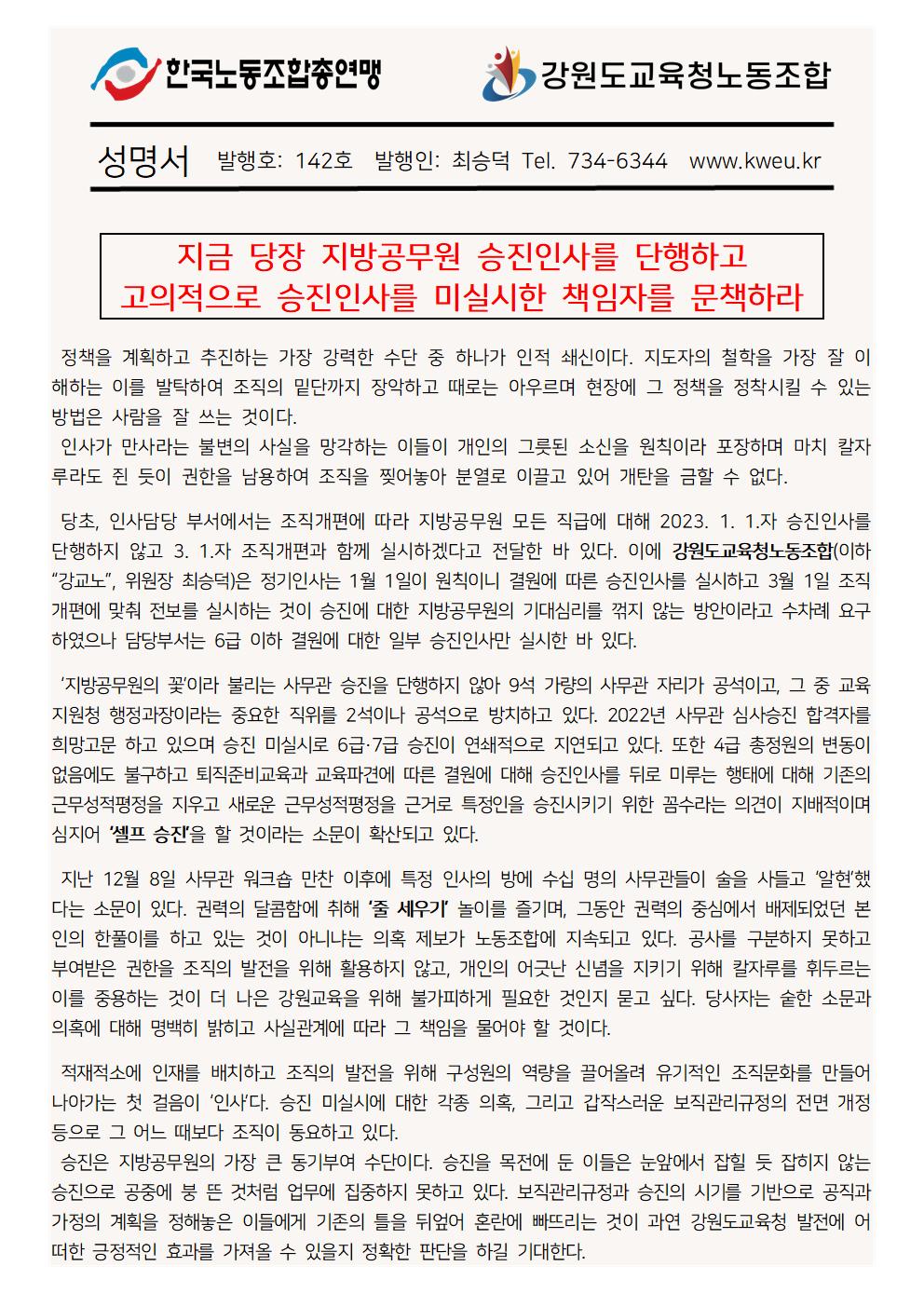 지금 당장 지방공무원 승진인사를 단행하고?고의적으로 승진인사를 미실시한 책임자를 문책하라