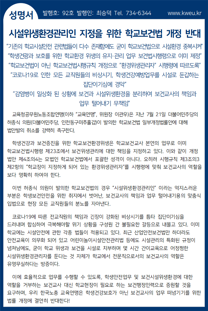 시설위생환경관리인 지정을 위한 학교보건법 개정 반대