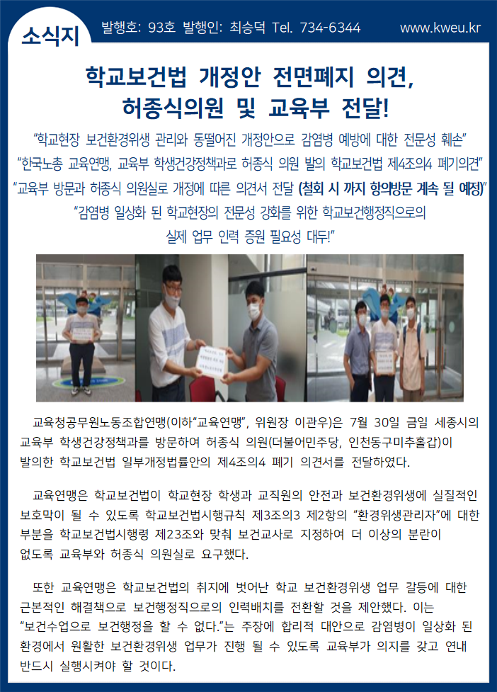 학교보건법 개정안 전면폐지 의견, 허종식의원 및 교육부 전달!