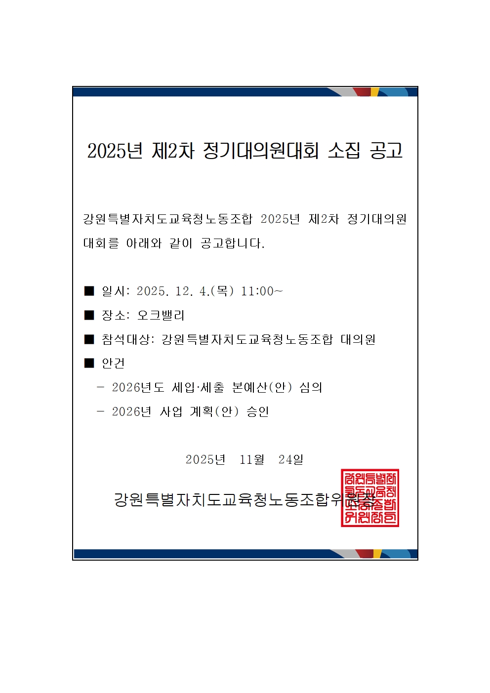 2025년 제2차 정기대의원대회 소집 공고